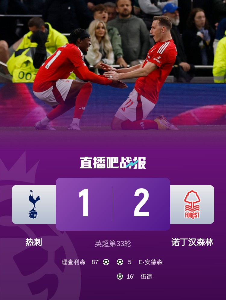 j9九游真人游戏第一平台04月22日讯 英超第33轮,诺丁汉森林2-1击败热刺,33轮后拿下60分排在英超第3位。